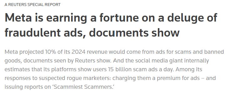 Perusahaan ini memiliki penilaian pasar saham sebesar $1,6 triliun. Laporan yang lebih mencengangkan dari @jeffhorwitz.bsky.social. https://www.reuters.com/investigations/meta-is-earning-fortune-deluge-fraudulent-ads-documents-show-2025-11-06/
