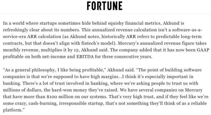 Hari ini Fortune menerbitkan artikel tentang Mercury yang merayakan: * Profitabilitas selama 3 tahun * Pendapatan tahunan sebesar $650 juta * Pertumbuhan pelanggan aktif sebesar 40% dari tahun ke tahun Profitabilitas adalah bagian penting dari kepercayaan yang kami bangun dengan pelanggan. Para pendiri mempercayai Mercury untuk membantu mereka mengelola modal yang diperoleh dengan susah payah, dan kami mengambil tanggung jawab tersebut dengan serius. Itu sebabnya kami berdisiplin dalam cara kami bertumbuh. DNA kami ada pada teknologi dan inovasi, namun kami juga beroperasi dengan standar yang sama dengan yang diharapkan nasabah dari lembaga keuangan mereka: neraca yang kuat, manajemen risiko yang cermat, dan operasional yang efisien. Inilah prinsip-prinsip yang membawa kami ke sini: • Memiliki unit ekonomi yang kuat sejak hari pertama. • Membangun produk hebat yang mendorong pertumbuhan organik (60% produk kami adalah organik). • Tetap disiplin dalam pembelanjaan dan perekrutan. • Fokus pada kepercayaan pelanggan dan penciptaan nilai jangka panjang dibandingkan tipu muslihat. Hargai Allie Garfinkle atas kisah bijaksananya. Maju.