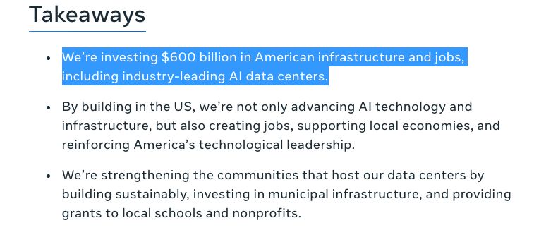 Zuckerberg mengatakan angka $600 miliar ini kepada Trump pada bulan September. Jadi dua bulan kemudian Meta menemukan cara untuk menghasilkan $600 miliar? https://about.fb.com/news/2025/11/meta-data-centers-drive-economic-growth-across-us/